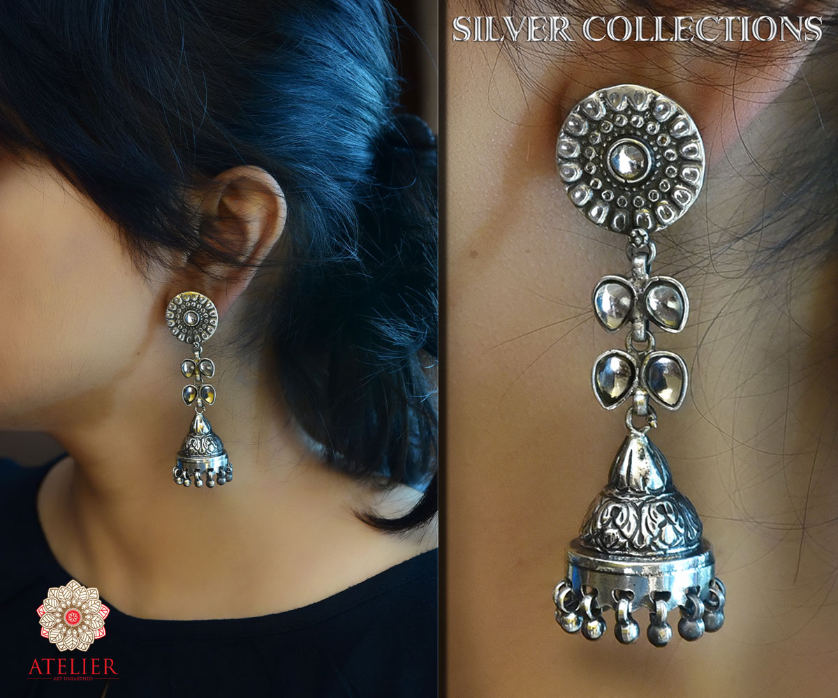 34.4 gms is the total weight of the ear rings , Made from glass stones , it is sleek and is 3 inches in length , Material used is 925 silver which is hallmarked.