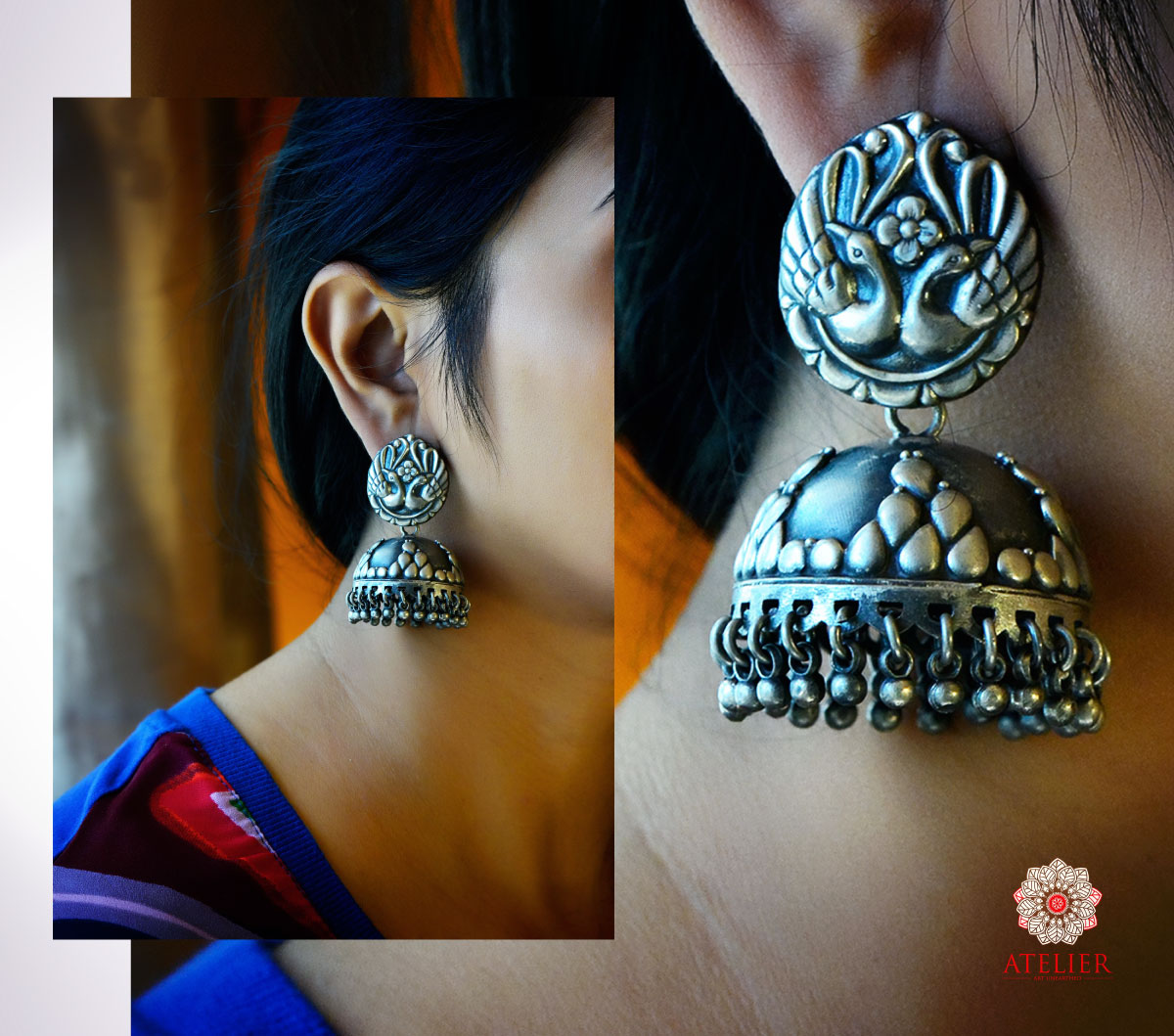 A beautiful dual peacock in the stud with jhumkas design in antique finish, Length 2.5 inches. Weigth 55 gms.